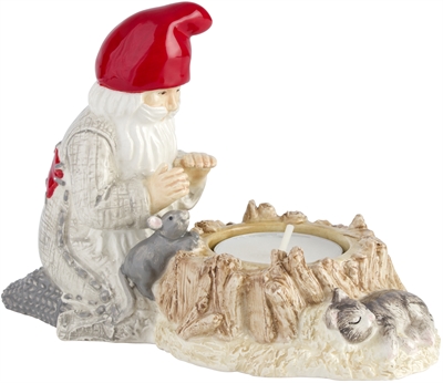 Tomte som sitter vid ett värmeljus och värmer sig tillsammans med en liten gullig katt och mus.