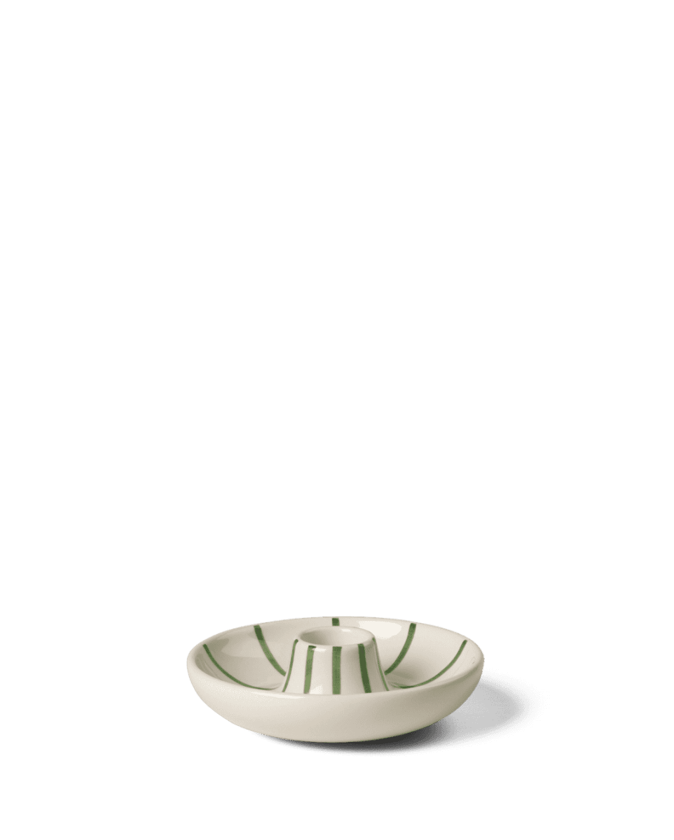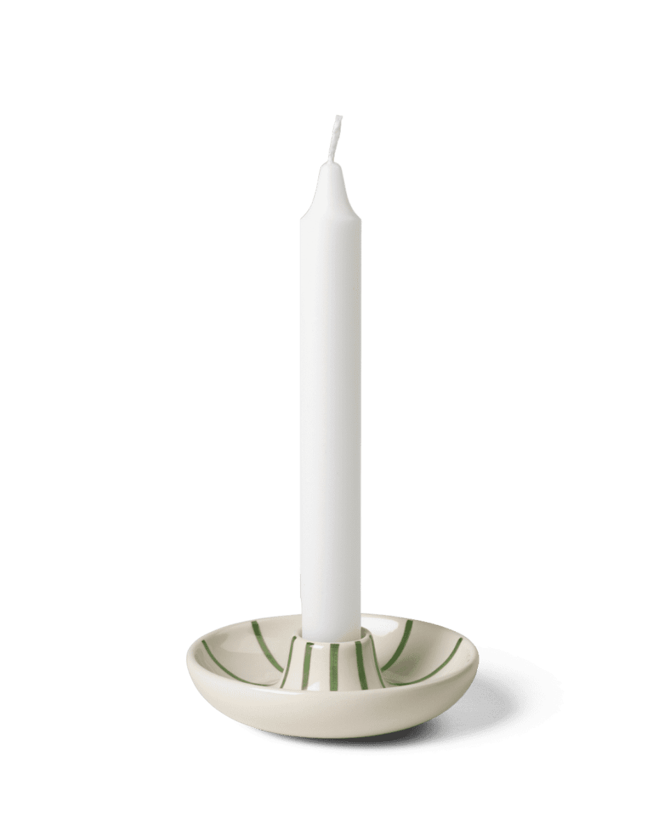 Nu har en ny ljushållare tillkommit i sortimentet. Ljushållaren i stengods har ett mjukt, organiskt uttryck med en vacker symmetri av blommor och blad.  Ljushållaren är för vanliga kronljus, de gröna ränderna målade för hand i samma anda som Kählers hantverksmässiga designtradition och har den livfullhet, dynamik och autenticitet som är så viktigt för Meyer Lavignes formspråk.