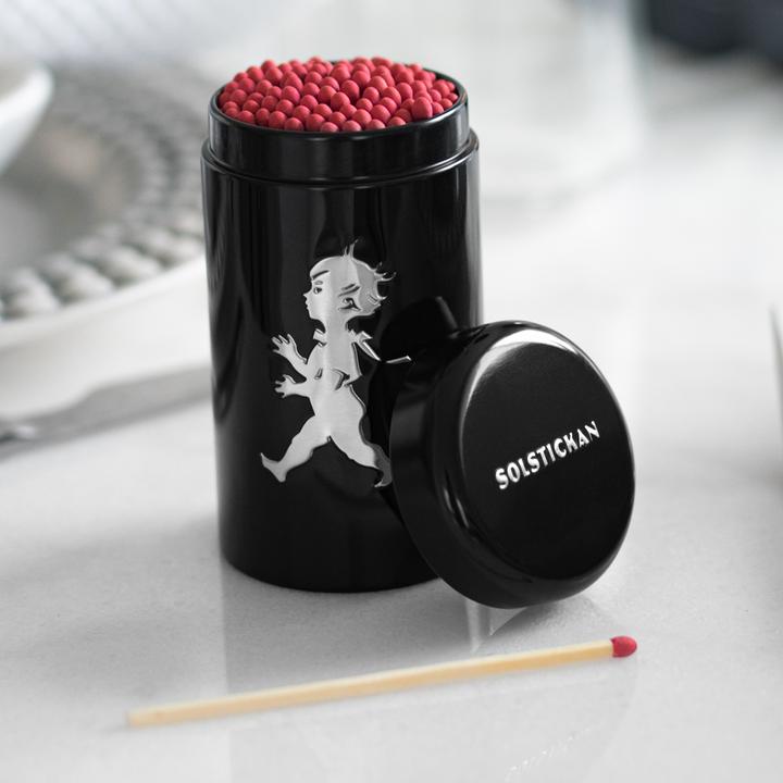 Solstickans stilrena svarta tändsticksrör i plåt med en silvrig avbildning av den klassiska Solstickepojken skapad av Einar Nerman 1936. Röret innehåller cirka 100 st extra långa svenska kvalitetständstickor tillverkade i Tidaholm av asp från svenska skogar.