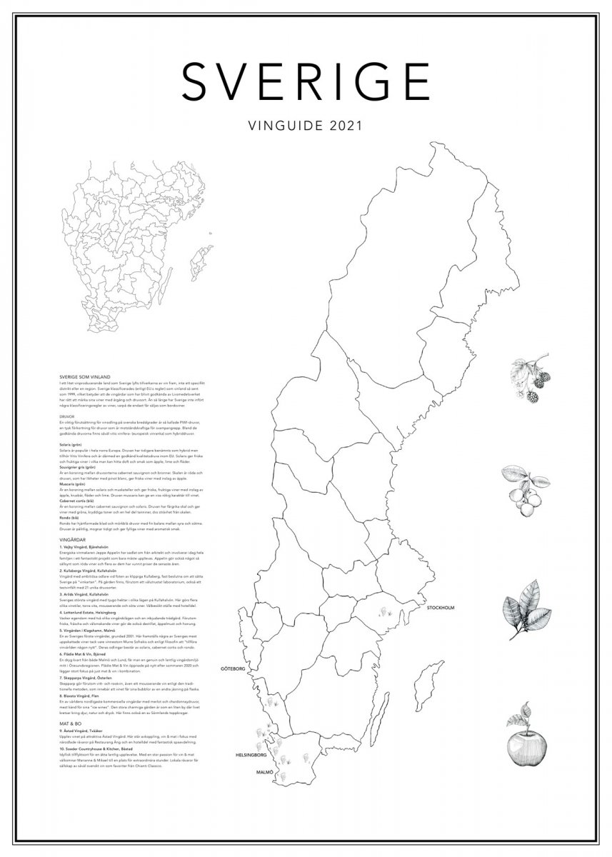 I ett litet vinproducerande land som Sverige lyfts tillverkarna av vin fram, inte ett specifikt distrikt eller en region. Än så länge har Sverige inte infört några klassificeringsregler av viner, varpå de endast får säljas som bordsviner. Vinguiderna är framtagna ur besök med engagerade vinbönder och passionerade vinmakare. Vi har återgett våra personliga favoritplatser och varje årgång är unik, precis som årgången på ett vin.