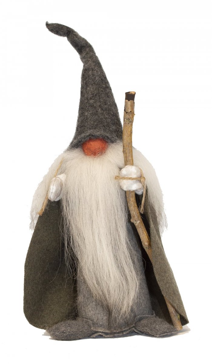 Kropp och cape sydd i vadmal. Näsa och luva tovad av ull och träkäpp plockad från de småländska skogarna. Mellan, ca 40 cm hög