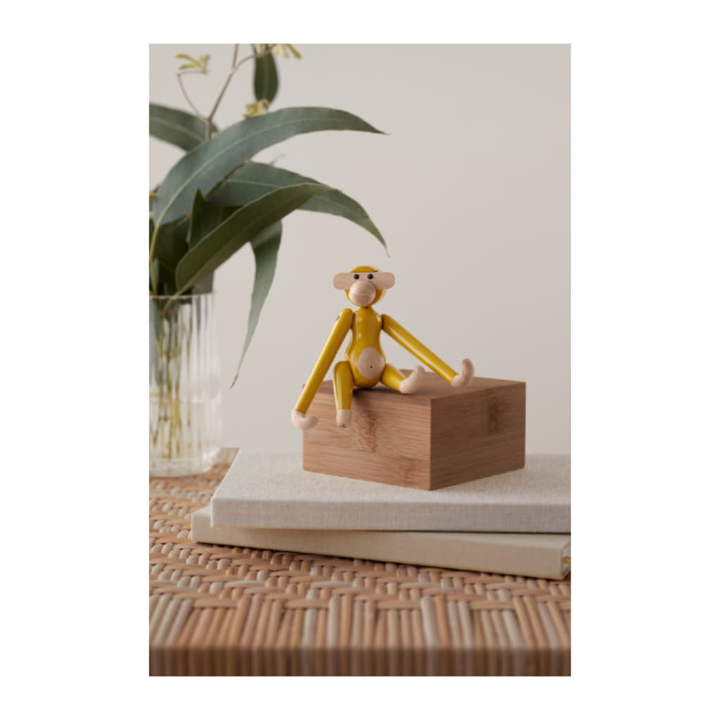 Miniversionen i bokträ i färgen vintagegul är hämtad från en originaltapet i arkiven, som Kay Bojesen designade till barnkammaren i slutet av 1940-talet. Den härliga gula retro-färgen passar perfekt till den designklassiker som Apan är.