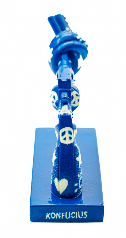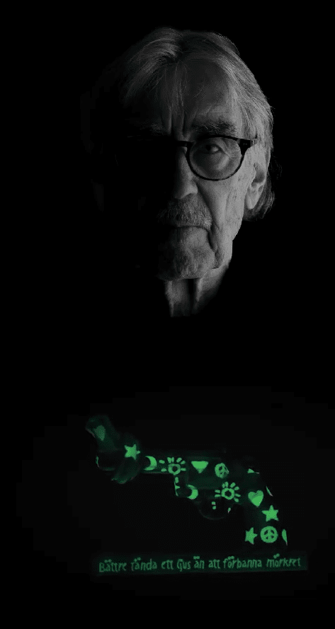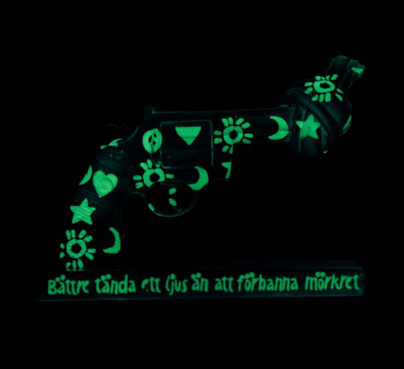 Lasse Åbergs idé om en självlysande Non-Violence skulptur kom från ett Konfuciuscitat; ”Bättre tända ett ljus än att förbanna mörkret”. Att hitta rätt färg var inte lätt, men efter några månader av sökande och testande hittade han, tillsammans med Jonas Henriksson, en färg som gav den effekt de eftersökte.