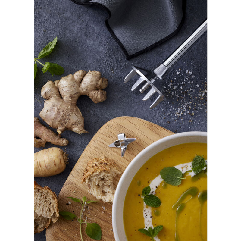 Mixern har en softgrip-säkerhetsknapp och spiralsladd för stor flexibilitet. Motorn är en kraftig växelströmsmotor på 200W som samtidigt är extremt dämpad. Transmissionen med kniven är fastskruvad direkt på motorn. Det betyder att den ingående strömmen omsätts direkt till kraftfull effektivitet. Funktion med 2 hastighetsinställningar