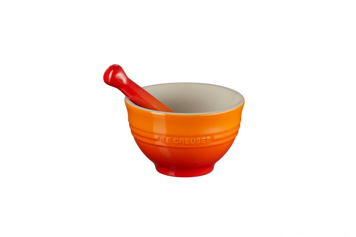 Mortel och stöt i stengods, med blank glacyr på utsidan men oglacerad insida. Även änden på stöten är oglacerad för att utnyttja friktionen som blir när man mortlar örter och kryddor