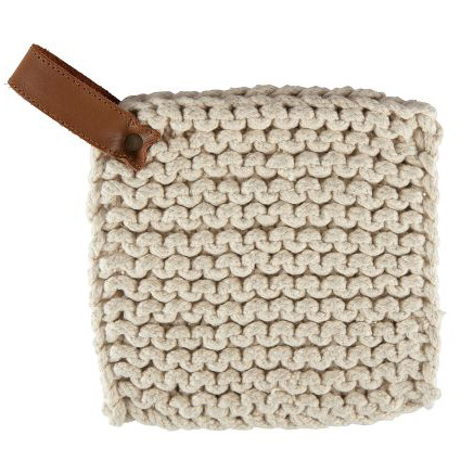 Snygg grytlapp tillverkad i återvunnen bomull. Fint skinhänge.