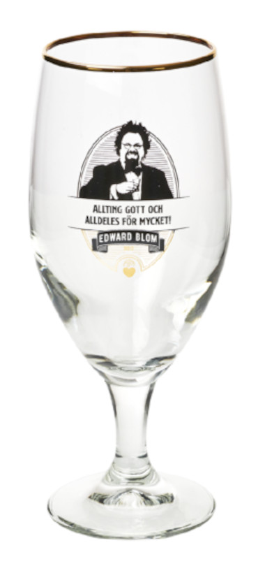 Edward Bloms ölglas har en klassisk modell med generös kupa som rymmer 40 cl. Med festlig guldkant, ett porträtt på Edward Blom och med ett träffsäkert citat, totalt 6 olika att välja bland, är detta en given succé som gåva. Perfekt att använda på mingelpartyt; om man kommer ihåg ”sitt” citat kan man också hålla koll på sitt glas även om man ställer det ifrån sig en stund.