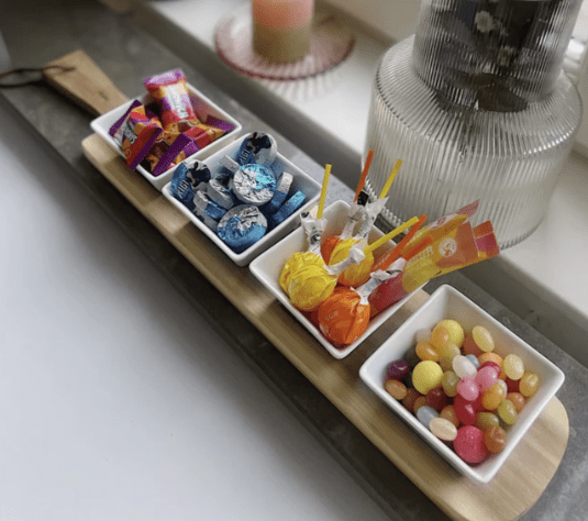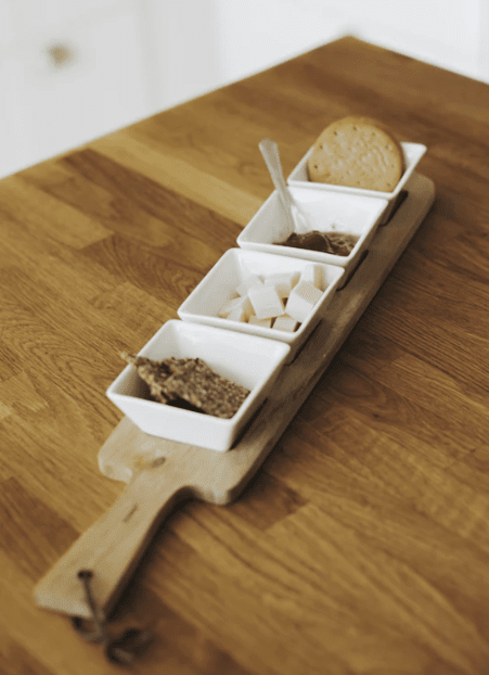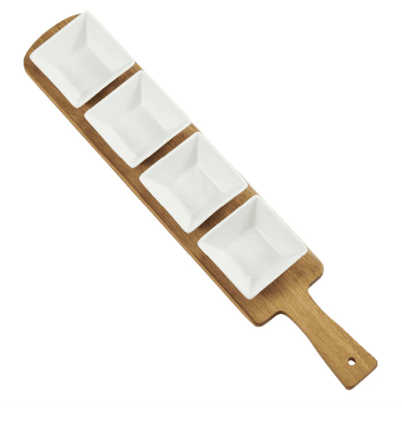 Serveringsbricka i akaciaträ med 4 skålar i porslin