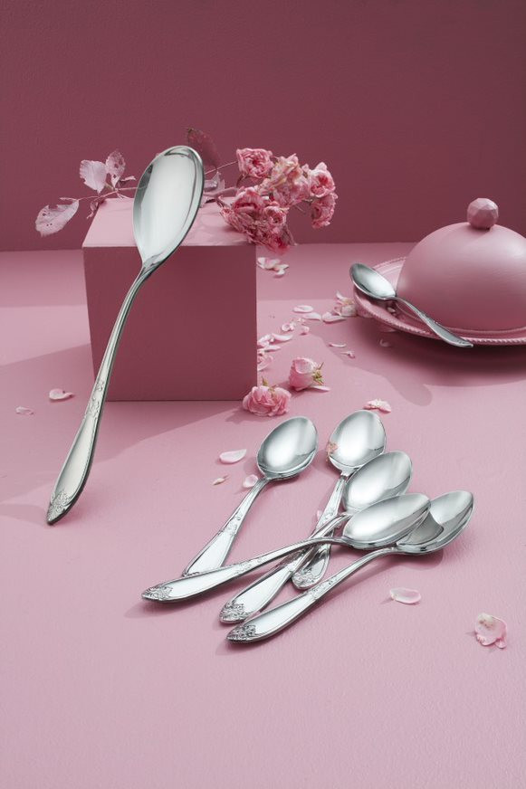 Designad av Odd Leikvoll 1998. Feminin, elegant och högtidlig design med utskärningar inspirerade av rosmålning. Ovala och detaljrika kanter. Polerad finish. Levereras i presentförpackning.