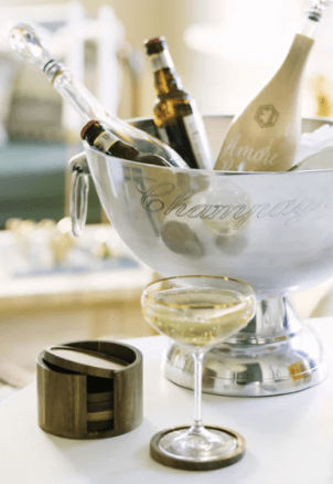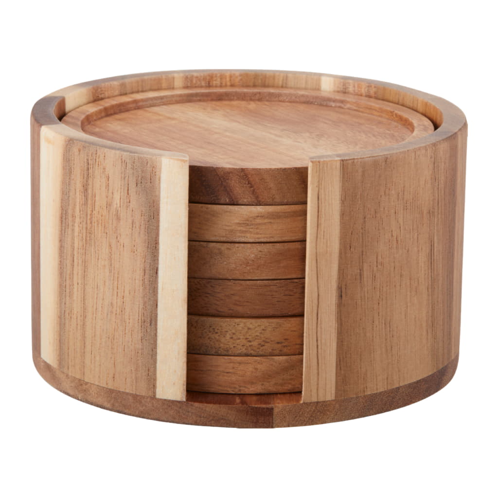 Snygga flask- och glasunderlägg i akacia, samlade i en praktiskt ställning