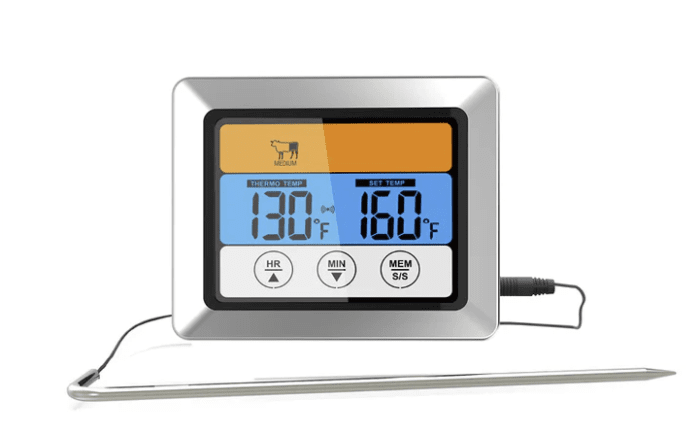 Denna termometer mäter innetemperaturen men går också att ställa in för att larma när råvaran upppnått önskad temperatur.