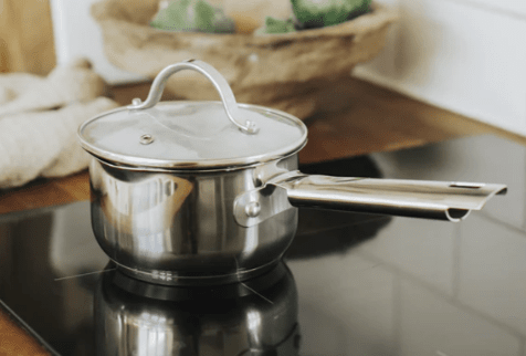 Praktiskt liten kastrull och glaslock med lufthål samt pip för att kunna hälla utan slabb.