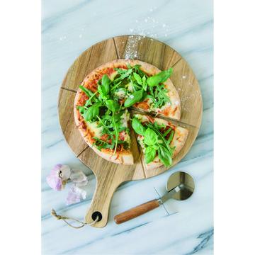 Serveringsskivan i akaciaträ har fördjupningar som gör det enkelt att skära upp pizzan i perfekta trekanter med den tillhörande skäraren.