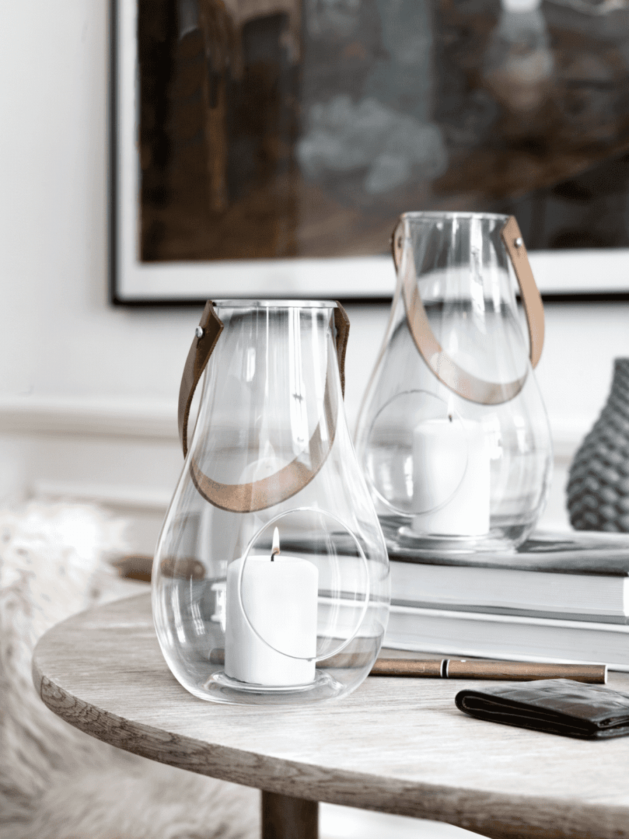 Maria Berntsen har skapat den mobila ljuskällan i glas och läder som sprider stämning i skandinavisk stil.