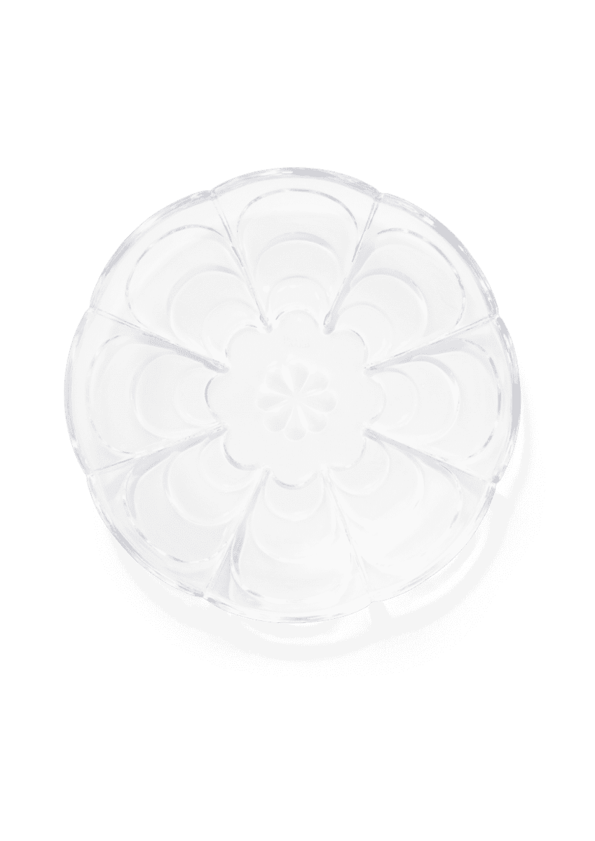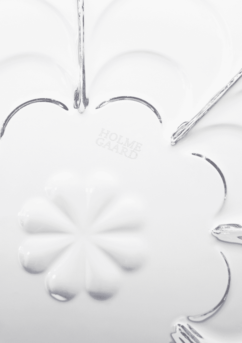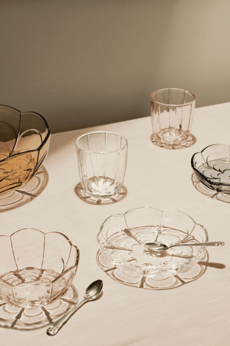 Blommönstret sticker ut som en relief i det formpressade glaset som är både transparent och taktilt. Linjerna i designen är enkla, mjuka och organiska men på ett strömlinjeformat och stilfullt sätt som skapar en fin balans mellan en romantisk och modern look. Desserttallrikarna är enkla att stapla och kan även diskas i diskmaskin, så att du kan använda dem varje dag utan att behöva oroa dig för att diska dem för hand.
