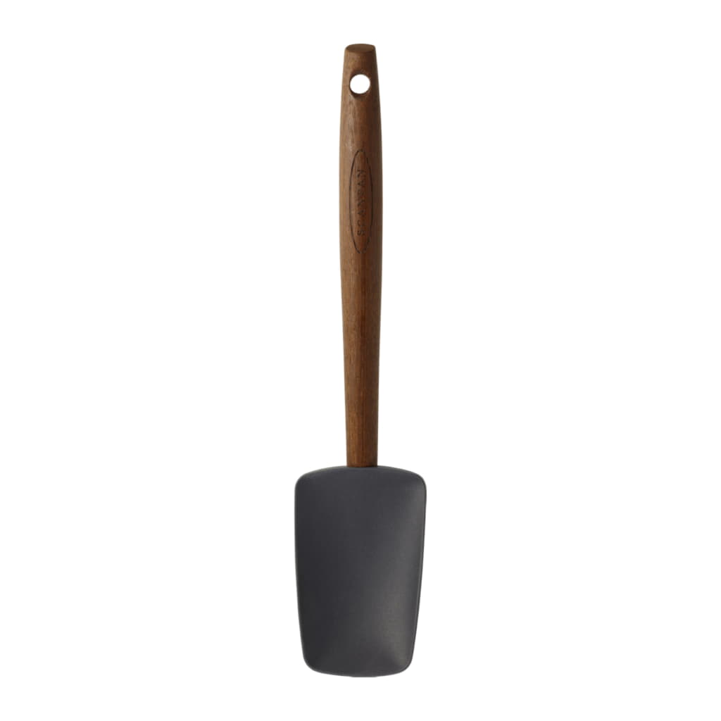 Silikonredskap med en kärna i rostfritt stål. Handtaget är värmebehandlad ask, tåligt men allt trä mår dåligt av maskindisk.