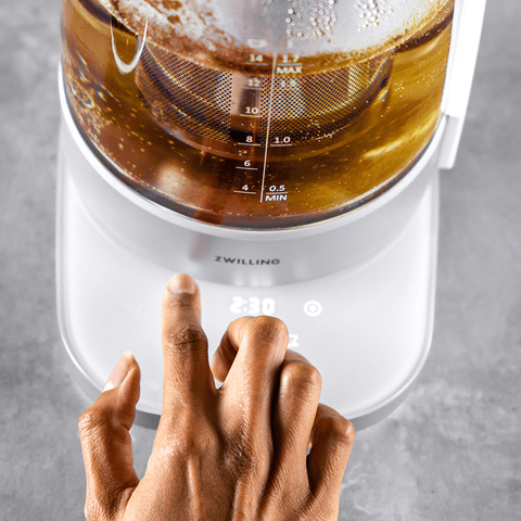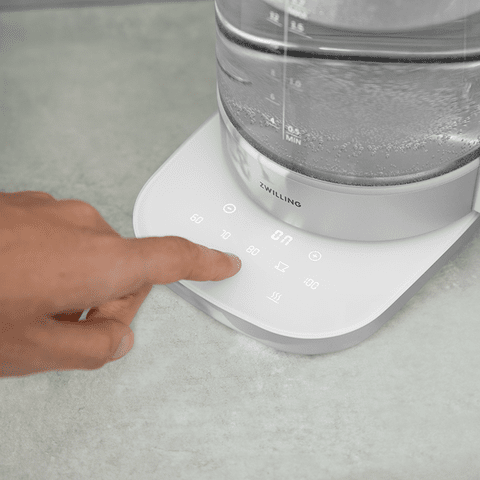 En vattenkokare i glas som är mångsidig, praktiskt och i en snygg design med silvervitt och vita detaljer. Vägen till perfekt te börjar med rätt temperaturinställning – och laddningsbasen på 360° låter dig välja mellan flera program. Med hjälp av förkokningsfunktionen kan vattenkokaren först värma upp vattnet till 100°C och sedan signalera när den önskade temperaturen har uppnåtts. Sedan häller du helt enkelt upp ditt te i teinsatsen i rostfritt stål. Den integrerade te-timern ger en signal när teet är klart. Du kan ställa in en bryggtid på mellan 0 och 10 minuter, beroende på vilken typ av te du vill ha.